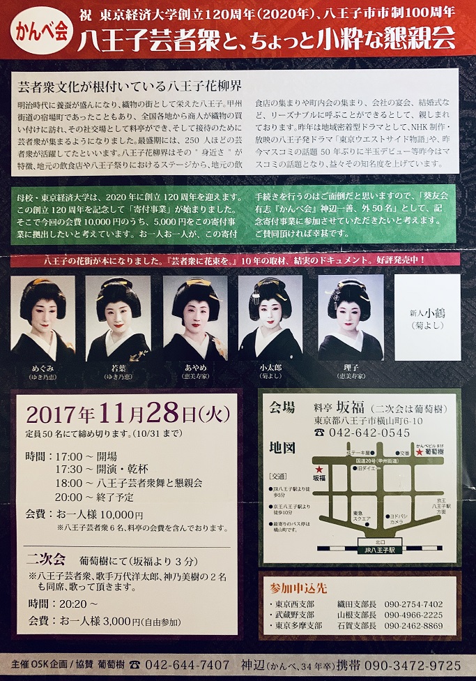 会費:お一人様10000円(八王子芸者衆6名、料亭のお食事代込み)